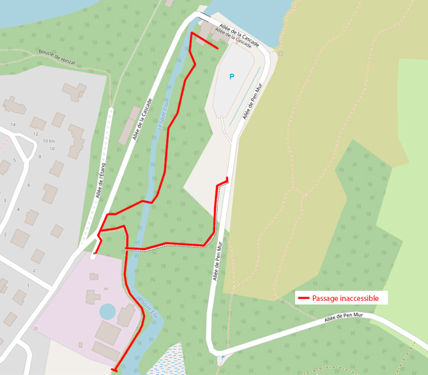 - Le sentier de l’allée de la cascade (au niveau des escaliers) sera inaccessible. Le passage se fera par le parking du moulin de Pen Mur.